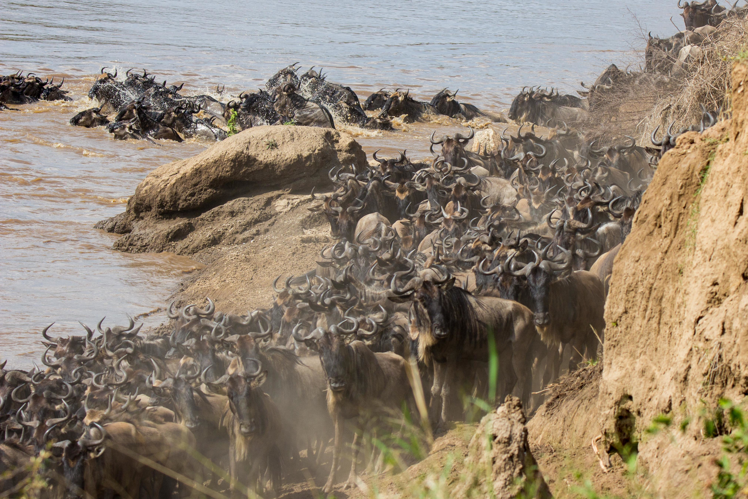 Schließlich erreichen die Tiere nach einem Marsch von beinahe tausend Kilometern den Rand der Massai-Mara und das größte Hindernis auf ihrer Reise: den Mara-Fluss. Die Überquerung des Stroms ist zweifellos einer der dramatischsten Höhepunkte ihrer Wanderung. Die Gnus stehen vor einem schier unüberwindbaren Hindernis – einem reißenden Fluss, der von gefräßigen Krokodilen bewohnt wird. Etwa 6.000 Tiere fallen den Fluten jedes Jahr zum Opfer. Die Luft ist erfüllt von aufgeregtem Trompeten und Brüllen der Tiere, während sie am Ufer stehen und keines den ersten Sprung wagen will. Von hinten kommen allerdings stetig mehr Gnus und Zebras nach und vorne wird es eng. Sobald sich das erste Tier ein Herz gefasst hat, gibt es schließlich kein Halten mehr. Nacheinander stürzen sie sich in die Fluten und schwimmen um ihr Leben. Die vier Meter langen Nilkrokodile, die größten Afrikas, haben womöglich das ganze Jahr lang nichts gefressen und erwarten ausgehungert das Buffet. Auf der anderen Seite, am rettenden Ufer angekommen, hat die Herde ihr Ziel schließlich erreicht: die Massai-Mara. Hier verbringen die Gnus und ihre Gefährten die restlichen Sommermonate, ehe sie im November mit der kurzen Regenzeit entlang der östlichen Grenzen der Naturschutzgebiete nach Tansania zurückkehren.