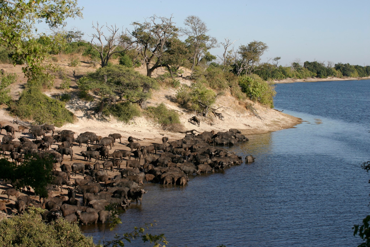 Die Reise führt uns weiter nördlich bis wir den Chobe-Fluss erreichen. In der Überschwemmungsebene entlang des Flussufers begeben wir uns auf Pirschfahrt und lauschen den Rufen des achtsamen Schreiseeadlers. Die nächsten Tage bestaunen wir die vielfältige Flora und Fauna und den beeindruckenden Artenreichtum der Tierwelt. Besonders Elefantenliebhaber kommen hier auf ihre Kosten, da große Herden häufig beim Überqueren des Flusses beobachtet werden können. Beim Sonnenuntergang über dem Fluss lassen wir die Seele baumeln und vergessen den Stress des Alltags zuhause.