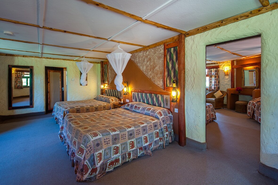 Die Lodge selbst ist von üppigen Gärten umgeben, in denen Dornbäume, Akazien, Bougainvillea und riesige Kakteen wachsen. Diese grüne Oase zieht zahlreiche Vogelarten sowie Affen, Mangusten, Eichhörnchen und gelegentlich sogar Leoparden an. Die 83 Gästezimmer sind in charmanten Cottages untergebracht, die großzügig in den Gärten verteilt sind. Jedes Zimmer ist mit Maasai-inspirierten Wandmalereien dekoriert und verfügt über eine eigene Veranda. Besonders luxuriös präsentiert sich die Präsidentensuite mit zwei Schlafzimmern, einem großen Wohnbereich, privatem Speiseraum und beeindruckender Terrasse.