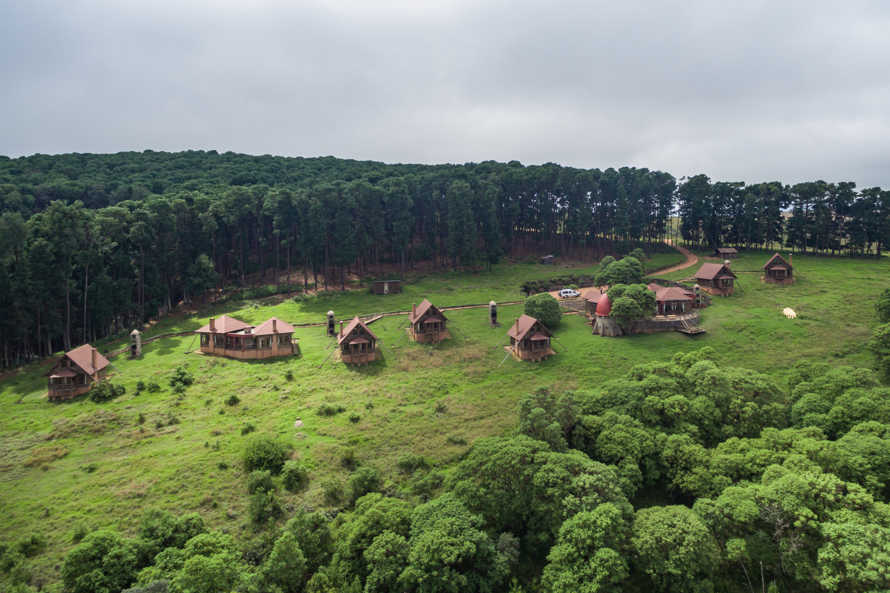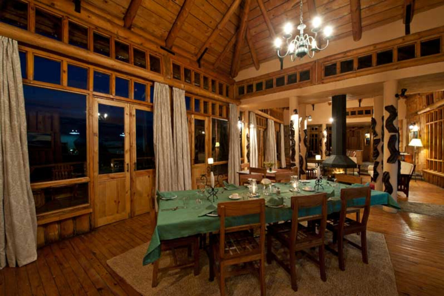 Die Lodge besteht aus acht gemütlichen Blockhütten, die aus lokalem Kiefernholz und Stein erbaut wurden. Jede Unterkunft bietet viel Platz, eine eigene Feuerstelle für die kühlen Nächte, ein großzügiges Badezimmer sowie eine private Veranda mit Blick auf die hügeligen Ebenen. Ein zusätzlicher Wohnbereich im oberen Stock erlaubt es, die Landschaft aus erhöhter Perspektive zu genießen. Familien profitieren von zusammenhängenden Chalets, in denen auch Kinder komfortabel untergebracht werden können.