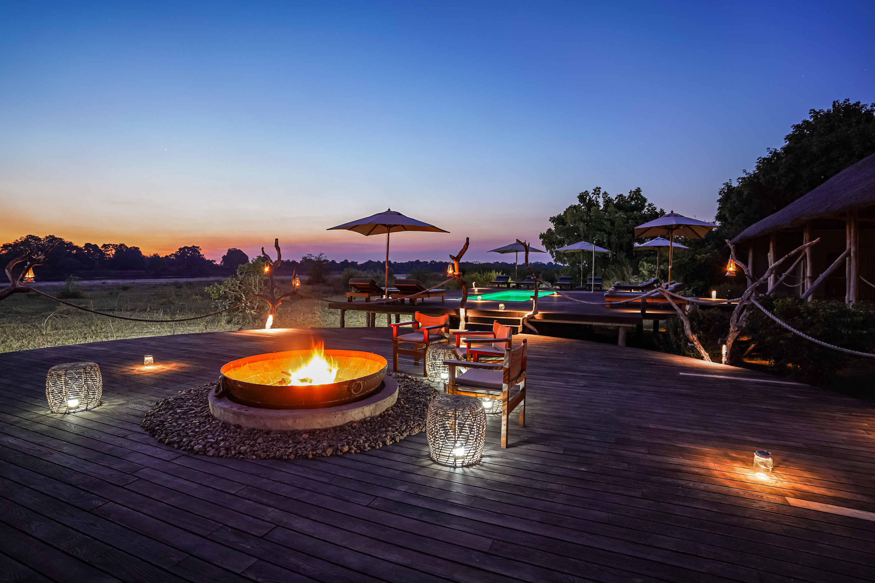 Die zentrale Lodge ist ein offener, luftiger Raum mit einer gemütlichen Lounge und einem gut ausgestatteten Barbereich. Sie können sich am Feuerplatz versammeln oder im einzigartigen Salzwasserpool mit Gegenstromanlage entspannen, der ideal zum Abkühlen oder für ein leichtes Training ist. Ein weiteres Highlight ist das Stargazing-Deck, auf dem Sie unter dem klaren Sternenhimmel Afrikas übernachten können – eine besondere Erfahrung, die vor allem für Hochzeitsreisende oder besondere Anlässe beliebt ist.