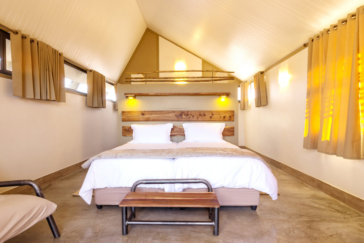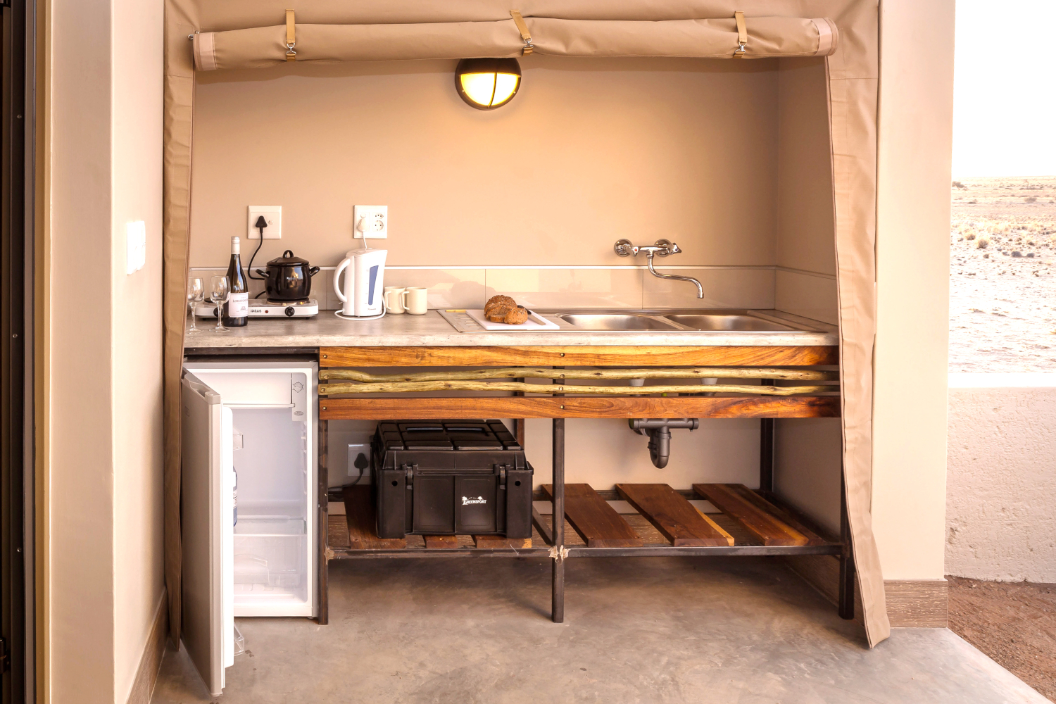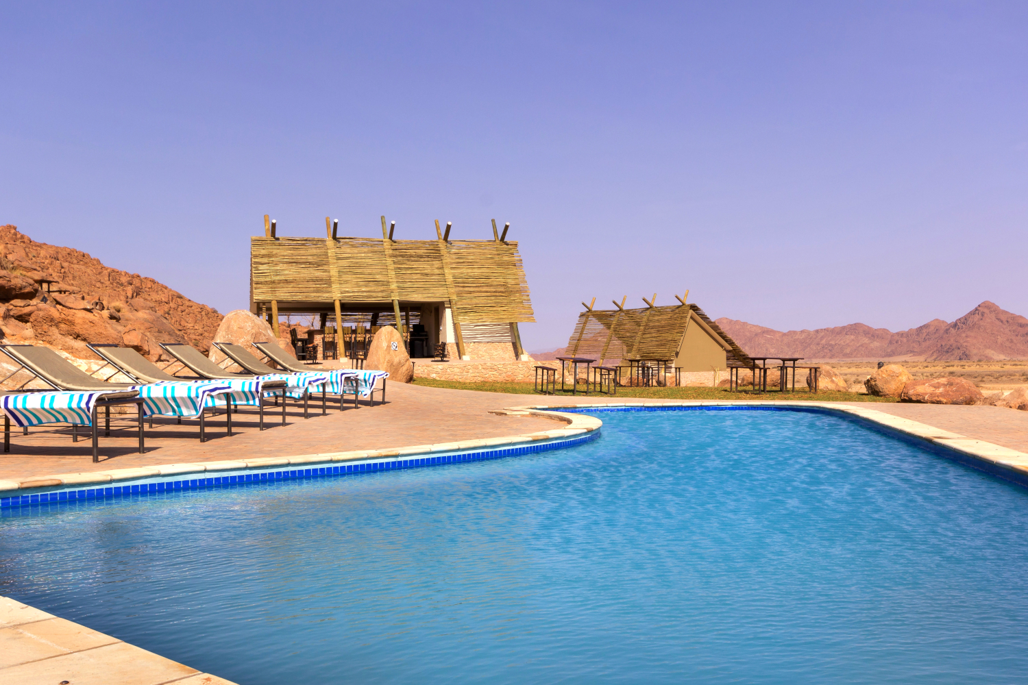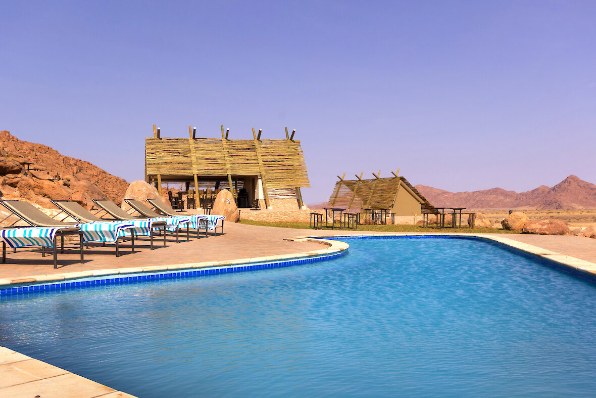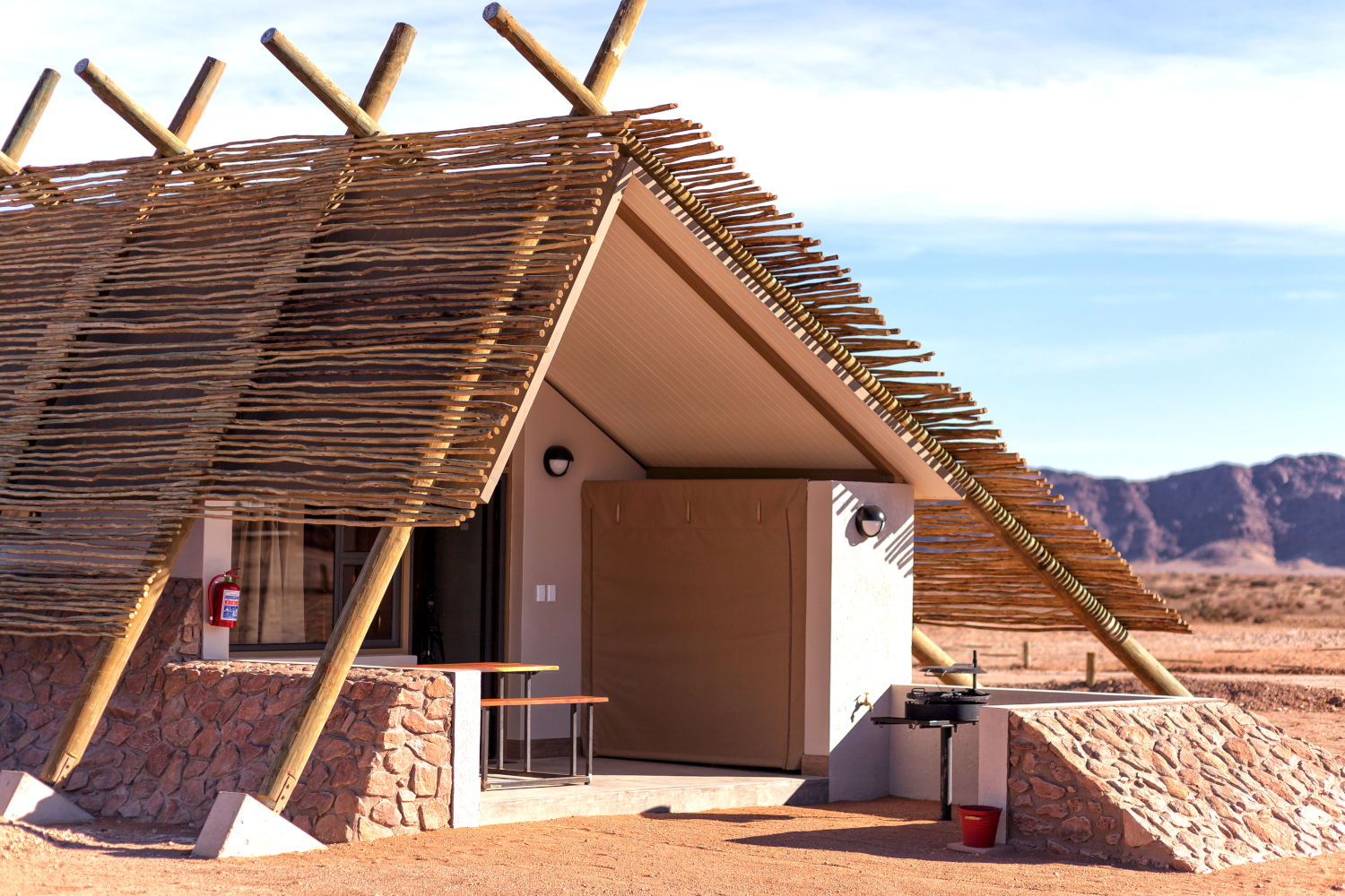 Nur wenige Kilometer vom Eingangstor zur Sossusvlei entfernt liegt das Desert Quiver Camp, eingebettet zwischen markanten Granitfelsen und offener Wüstenlandschaft. Die Lage macht das Camp zu einem idealen Ausgangspunkt, um die Dünenregion des Namib-Sandmeers früh am Morgen zu erreichen und die besondere Atmosphäre der Sossusvlei im weichen Licht des Tagesbeginns zu erleben. Die Unterkunft besteht aus 24 modernen Chalets, die für Selbstversorger konzipiert wurden. Jedes Chalet verfügt über eine private Terrasse, die einen ruhigen Blick in die Landschaft bietet. Die Architektur verbindet klare Formen mit natürlichen Materialien und fügt sich harmonisch in das Wüstengelände ein. Die Chalets sind funktional eingerichtet und bieten ausreichend Raum für Erholung nach einem Tag voller Eindrücke. Ein besonderes Highlight ist der großzügige Außenpool, der sich perfekt in das Gelände einfügt. Von hier genießen Sie eine eindrucksvolle Aussicht auf die Elim-Düne, die je nach Sonnenstand in warmen Farbtönen leuchtet. Der Poolbereich lädt zum Entspannen ein und bietet eine angenehme Abkühlung in der trockenen Wärme der Namib. Auf dem Gelände stehen Ihnen überdachte Grillplätze und saubere Gemeinschaftsbereiche zur Verfügung, die ideal für Selbstversorger-Reisen sind. Die offene Anlage vermittelt ein Gefühl von Weite, ohne auf Komfort verzichten zu müssen. Das freundliche Team unterstützt Sie gern bei der Planung Ihrer Aktivitäten im NamibRand‑Gebiet und rund um die Sossusvlei. Das Desert Quiver Camp verbindet moderne Selbstversorger‑Unterkünfte, eine einmalige Lage und entspannte Atmosphäre – ein stimmiger Ort, um die Schönheit der Namib aus nächster Nähe zu erleben.
