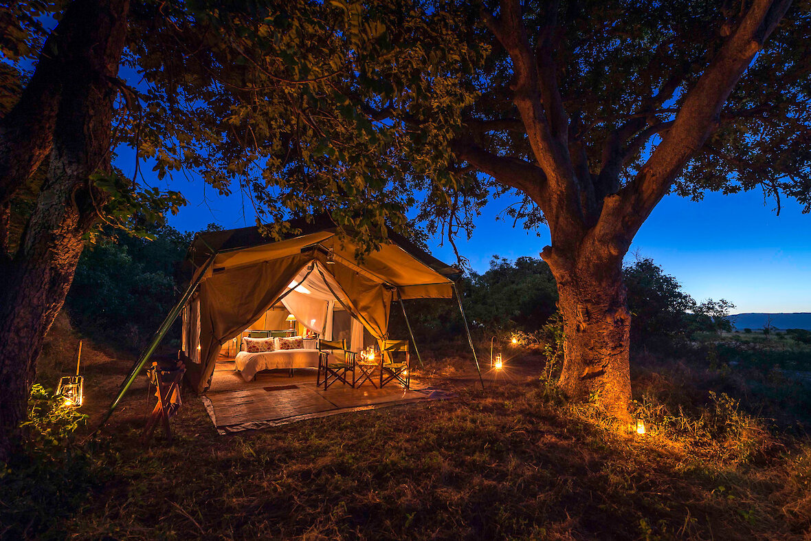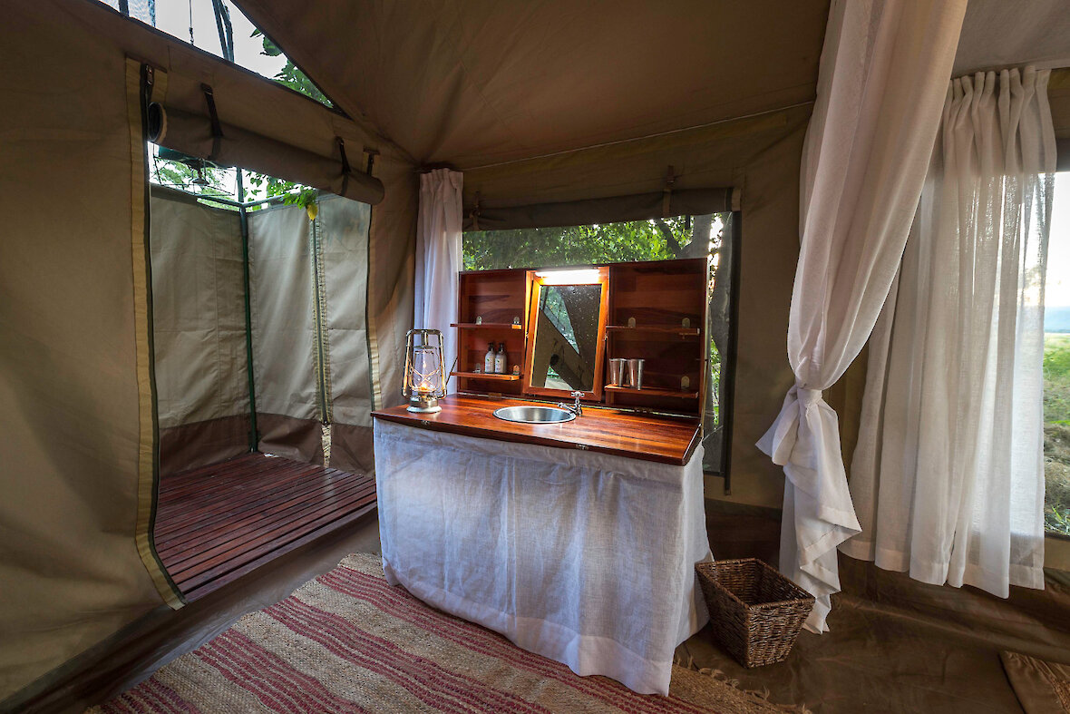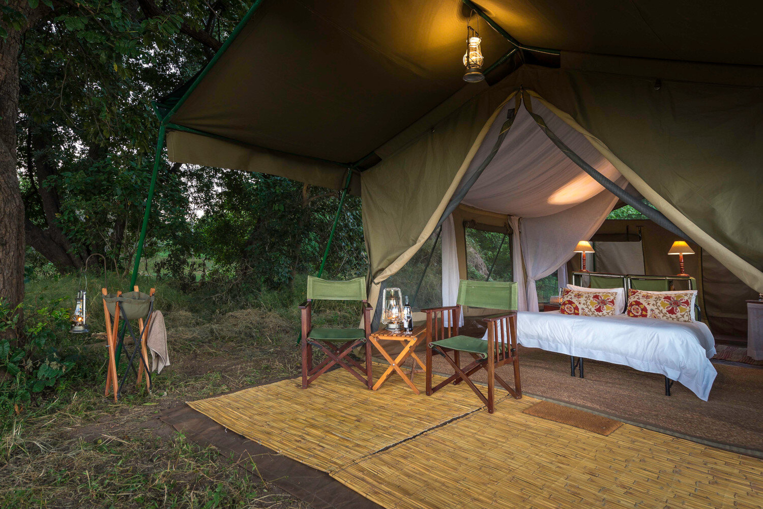 Die nur insgesamt sechs Zelte befinden sich auf beiden Seiten des Hauptbereiches, liegen entlang des Flussufers, sind unter Schatten spendenden Bäumen errichtet worden und bieten viel Privatsphäre. Die Zelte sind mit Moskitonetzen versehen, sodass ein erholsamer Schlaf auch bei geöffneten Segeltuch-Fenstern möglich ist. Von der eigenen Veranda aus können Sie dem Treiben am Fluss zuschauen. Das Badezimmer besteht aus einer klassischen Spültoilette, einem Waschbecken und einer traditionellen Eimerdusche, die auf Wunsch mit warmem Wasser gefüllt wird.