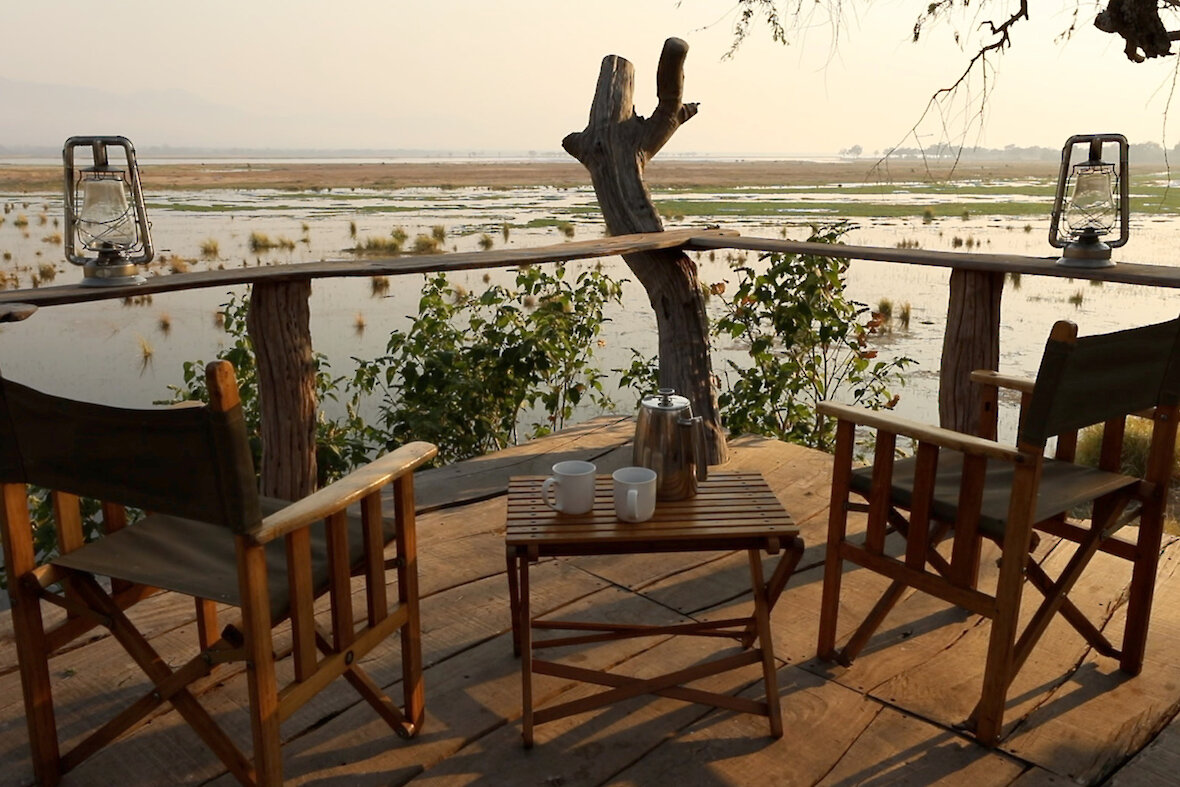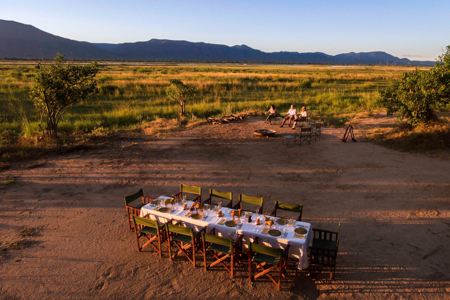 Zentrale Anlaufstelle ist die Lounge in einem offen Zelt mit bequemen Sitzgelegenheiten und Blick auf den Sambesi. Im Speisebereich werden die Mahlzeiten an einem großen Tisch zusammen mit den anderen Gästen des Camps eingenommen. Wer sich mehr Privatsphäre wünscht, kann auch im Freien und näher am Fluss speisen.