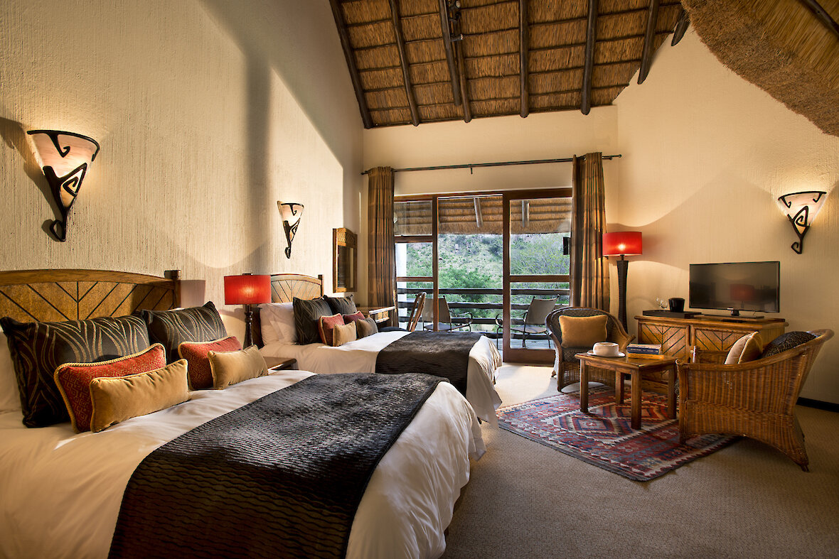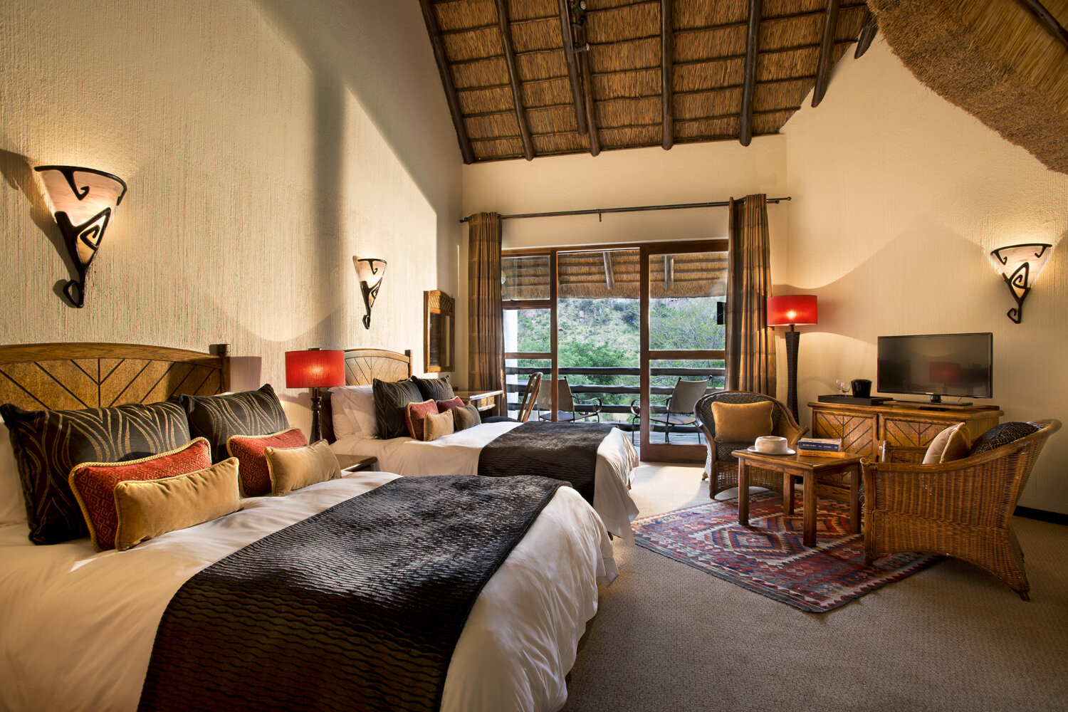 Für Entspannung sorgt das Spa mit exklusiven Behandlungen. Zwei Pools, Tennisplätze und ein Fitnessbereich runden das Angebot ab. Kinder freuen sich über den Spielplatz, die Wasserrutsche und das Junior-Ranger-Programm. Abenteuerlustige können Pirschfahrten oder Fußpirsch unternehmen und die „Big Five“ entdecken. Ein unterirdischer Tunnel führt zu einem Beobachtungspunkt am Wasserloch – ideal für Tierbeobachtungen aus nächster Nähe.