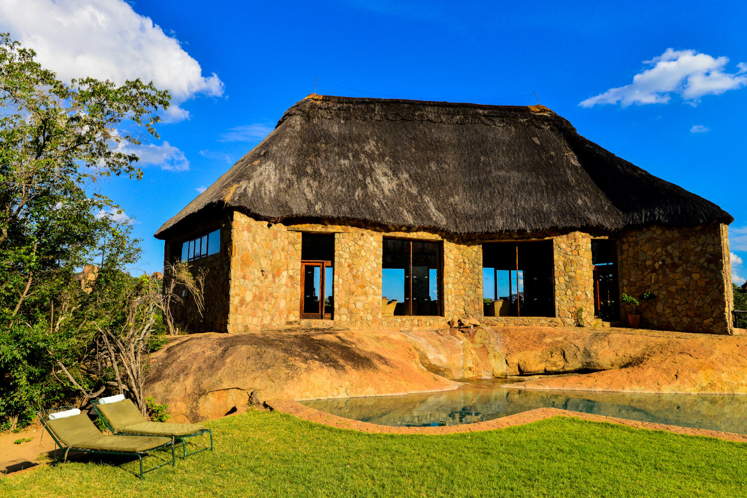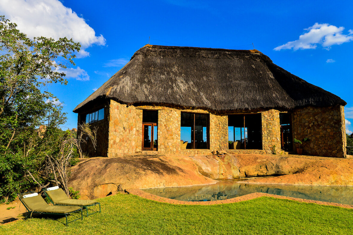 Die Lodge besteht aus traditionell gestalteten, strohgedeckten Chalets, die mit Naturstein und warmen Materialien gebaut wurden. Jedes Chalet verfügt über eine private Veranda, von der aus Sie den Sonnenaufgang über den Granithügeln genießen oder abends den afrikanischen Sternenhimmel bewundern können. Die Zimmer verbinden rustikale Authentizität mit modernem Komfort – inklusive eigenem Bad, bequemen Betten und liebevollen Details, die den Aufenthalt besonders angenehm machen.
