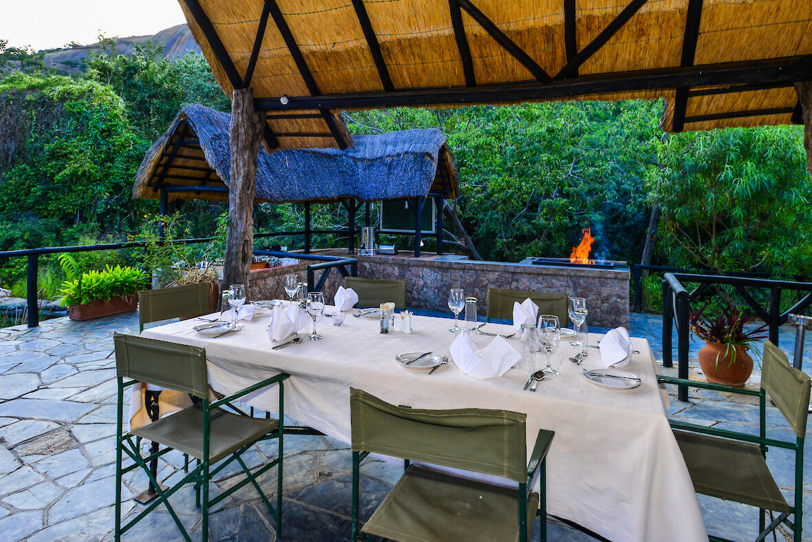 Für Entspannung sorgt der Poolbereich, umrahmt von Felsen und Savannenvegetation. Im Restaurant genießen Sie regionale Küche und frisch zubereitete Gerichte, die den Tag perfekt abrunden. Abende am knisternden Lagerfeuer schaffen eine besonders stimmungsvolle Atmosphäre.