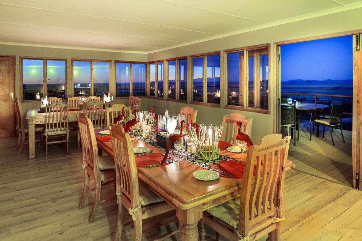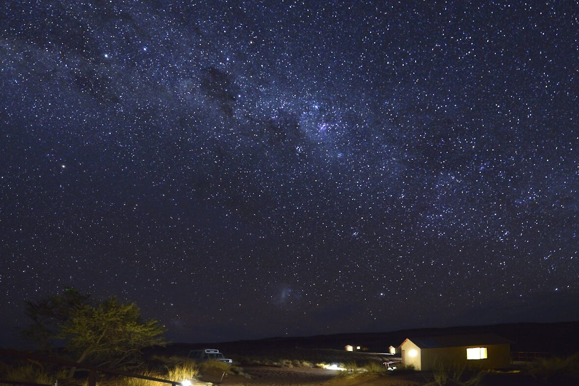 Nachhaltigkeit steht im Namib Dune Star Camp im Vordergrund. Die gesamte Anlage wird mit Solarenergie betrieben, Wasser stammt aus einer nahegelegenen Quelle, und beim Bau wurde großer Wert darauf gelegt, die empfindliche Umwelt so wenig wie möglich zu belasten. Trotz seiner Abgeschiedenheit bietet das Camp erstaunlichen Komfort: Eine warme Dusche, gutes Essen und eine friedliche Atmosphäre machen den Aufenthalt zu einem einmaligen Erlebnis. Am Abend lädt das Hauptdeck zu einem Sundowner ein, während die Sonne langsam hinter den Dünen verschwindet und die Landschaft in magisches Licht taucht.