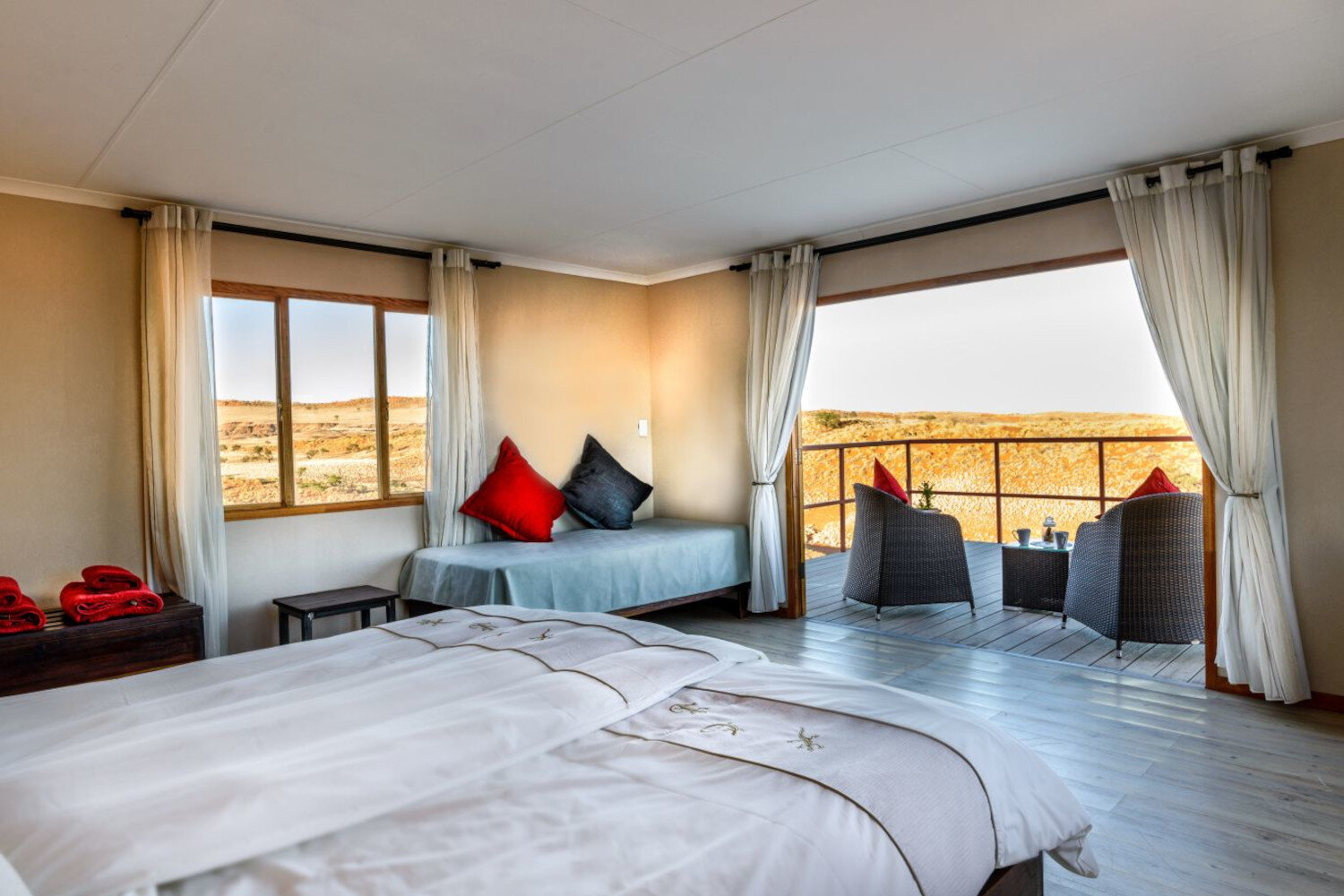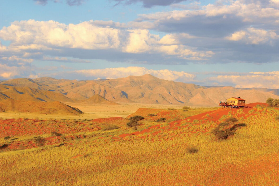 Das Namib Dune Star Camp liegt malerisch auf einer sanft geschwungenen Düne am Rande der ältesten Wüste der Welt – der Namib. Von hier aus eröffnet sich ein atemberaubender Blick über endlose Sandlandschaften, die im warmen Licht der Sonne in goldenen, roten und ockerfarbenen Tönen leuchten. Das Camp besteht aus neun gemütlichen Holzchalets, die in respektvollem Abstand zueinander errichtet wurden, um Privatsphäre und Ruhe zu gewährleisten. Jede Hütte ist komfortabel ausgestattet, mit eigenem Bad, einer kleinen Veranda und einem großzügigen Schlafzimmer. Ein besonderes Highlight sind die verschiebbaren Betten: Sie lassen sich auf Rollen nach draußen schieben, sodass Sie unter dem funkelnden Sternenhimmel der südlichen Hemisphäre schlafen können – ein unvergessliches Erlebnis mitten in der Wüste.