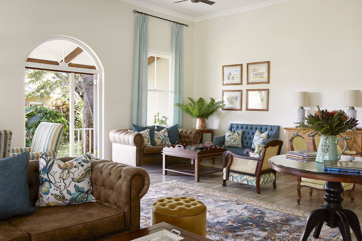 Der zentrale Bereich der Lodge lädt zum Verweilen ein: Eine gemütliche Lounge, ein freundlicher Speisesaal und eine weitläufige Terrasse mit Blick auf die Gärten schaffen vielfältige Orte für Entspannung und geselliges Beisammensein. Zwei Swimmingpools, eingebettet in die üppigen Gartenanlagen, bieten Erfrischung an warmen Tagen. Ein kleines Spa ergänzt das Angebot und sorgt für Momente der Ruhe.