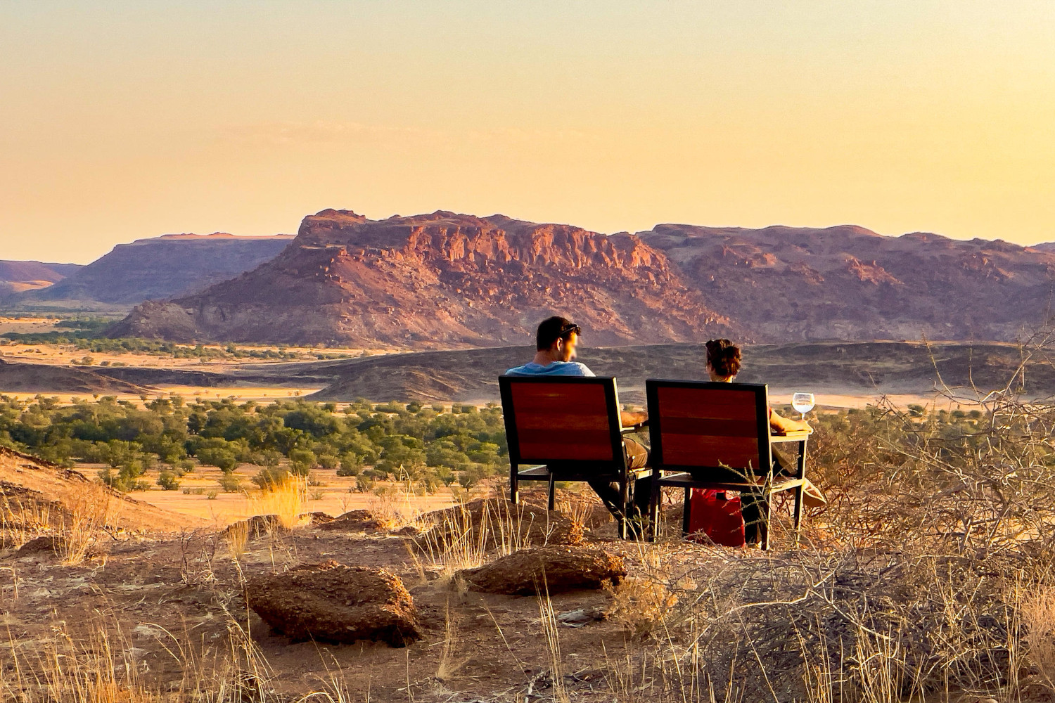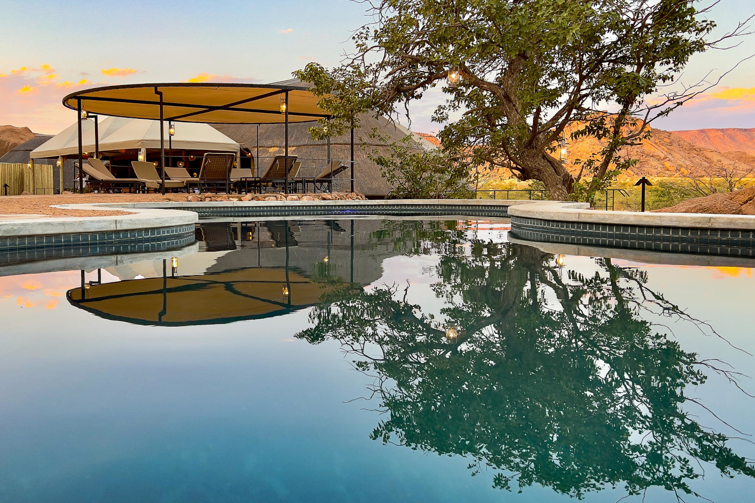 Zwischen den Granitkugeln, die so typisch für das Damaraland sind, finden Gäste das offene Restaurant zusammen mit der Bar, wo Ihnen jeden Abend leckere Gerichte serviert werden. Die Sonnenliegen am Pool laden zum Entspannen nach einer Erkundungstour ein und vom sogenannten „Sundowner-Spot“ genießen Sie einen unbeschreiblichen Ausblick auf rotangestrahlten Granitfelsen zwischen denen Wüstenelefanten wandern.